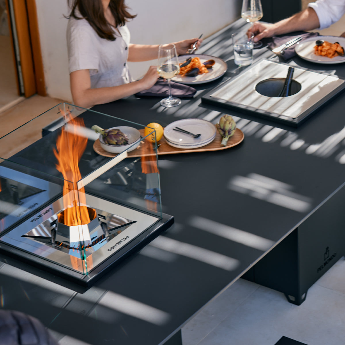 Cube offers more than just stylish outdoor decor; its comforting warmth and dancing flames provide the perfect ambiance for relaxation throughout the year. With the added table top, it easily transforms into a modern patio table, offering ample space for beverages and snacks.