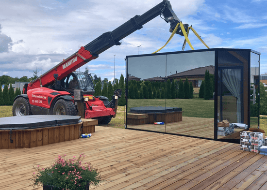 Hele Double is the largest version of the Hele mirror sauna, designed for up to 6 people. It is a complete oasis that fits a changing room and sauna, equipped with a wood-burning stove — perfect for an authentic and peaceful sauna experience.