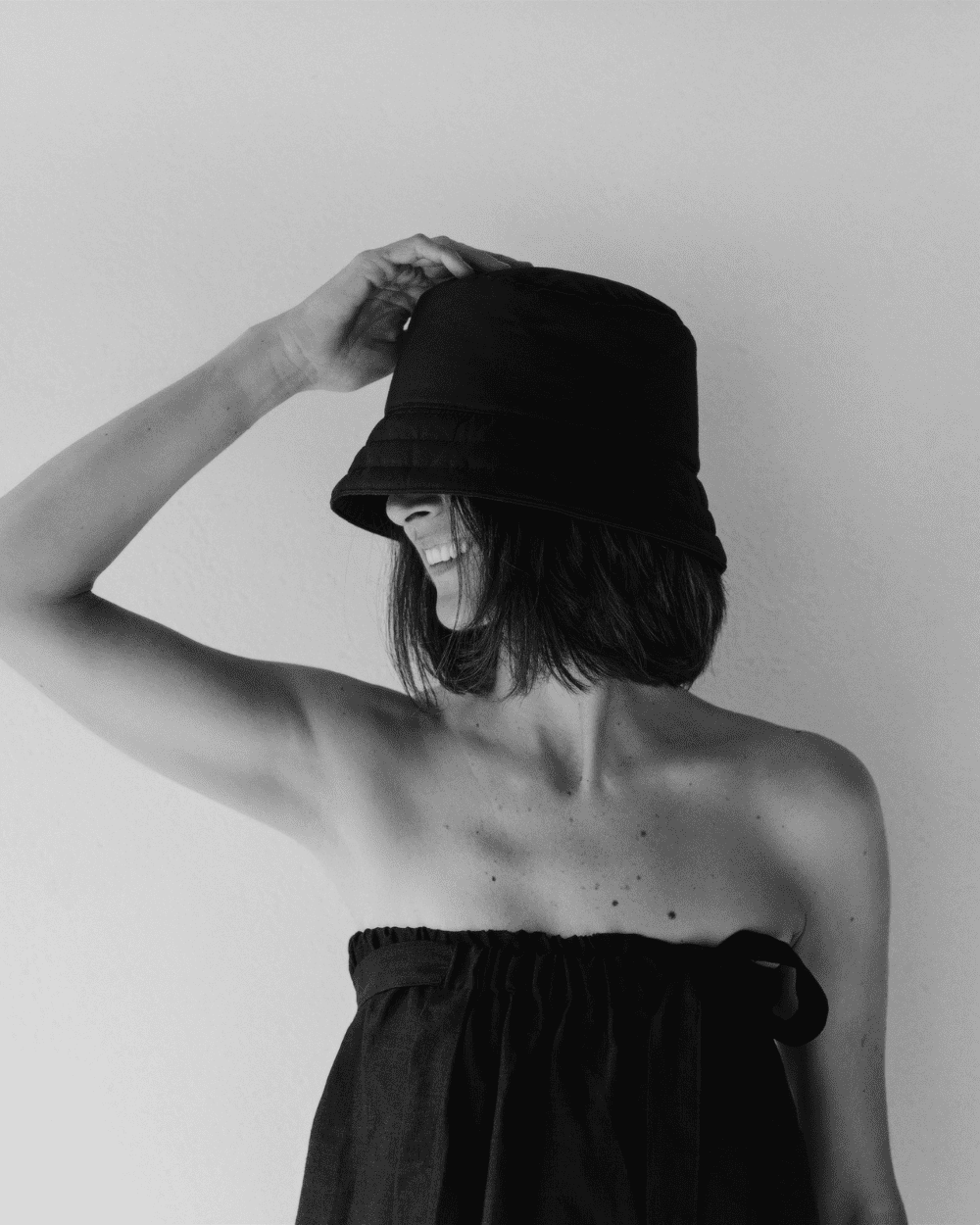 A modern bucket-style sauna hat with a functional design — soft, comfortable on the head, and finished with an elegant brim that helps protect the eyes from hot steam.