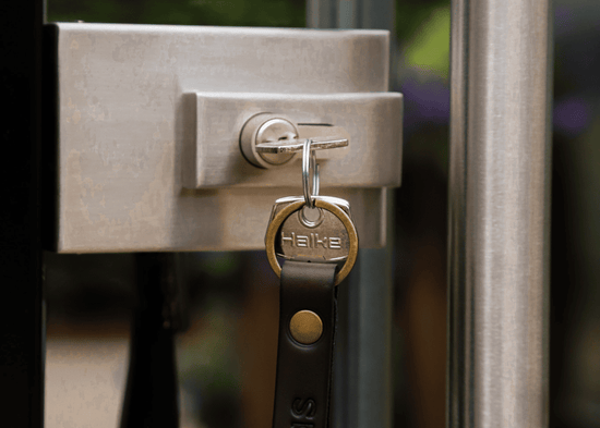 Saunas durvis ar rullīša fiksāciju un nerūsējošā tērauda slēdzeni.