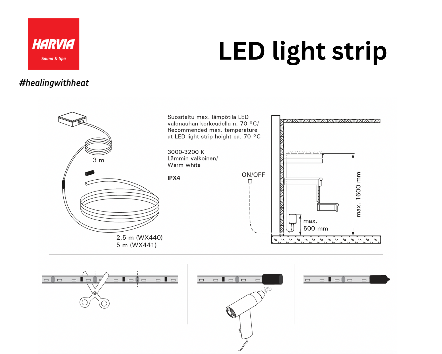 LED lentu var novietot max augstumā no zemes 1600 mm. Lentu nedrīkst likt pirts griestos.